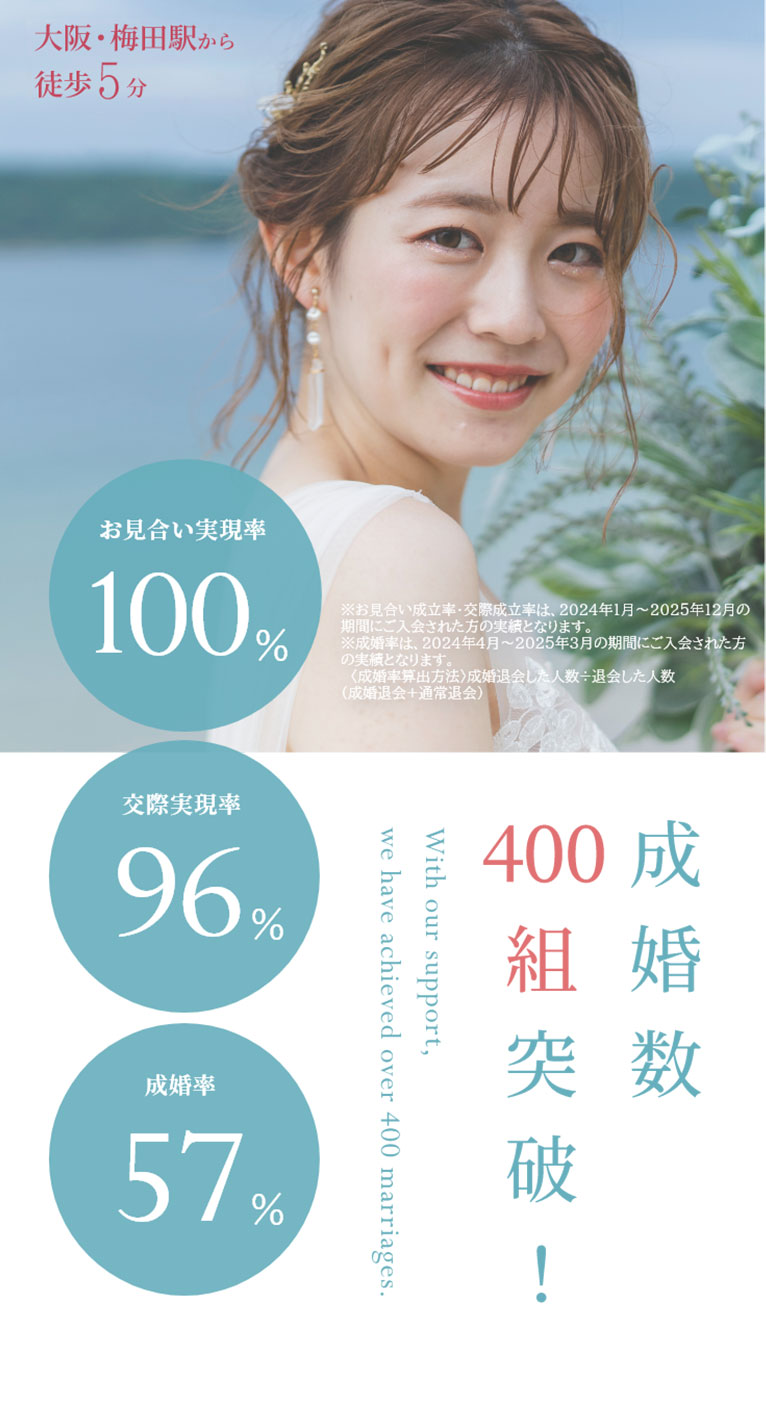 - 成婚への一番の近道は、たくさんの異性と出会い、その中で自分に合ったお相手を見つけることです。ご入会当初は平均5回、ご成婚までに約10~20回お見合いする方が多く、毎回の出会いに対して料金が発生してしまうと料金のことを気にしてしまい「出会い」に対して消極的になってしまう可能性があります。毎月のランニング費用を気にせず「出会い」の可能性を最大限に高めたサービスを提供しています。お見合い実現率100%、交際実現率96%(2024年、2025年ご入会の会員様実績)